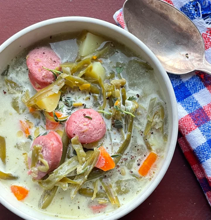 Rheinische Schnibbelbohnensuppe mit frischem Bohnenkraut und Rahm. Wahlweise mit Mettwurst