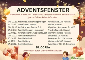 Im Rahmen der ADVENDTSFENSTER-AKTION des Dorfes Hauset laden wir euch zu einer kleinen besinnlichen Auszeit an unserer Feuerschale zu Stock-Brot, Zimt-Schnecke, Kinder- und Glühweinpunsch ein.